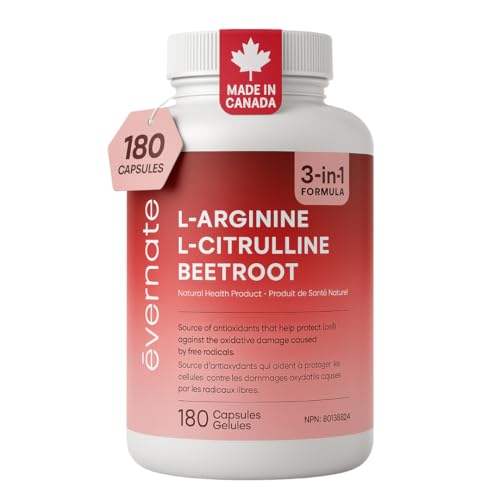L-Arginine 590 mg, L-Citrulline 266 mg & Beetroot (Per Serving: 2 Capsules) – 3-in-1 Nitric Oxide, Circulation & Energy – 180 Vegan Capsules – Made in Canada